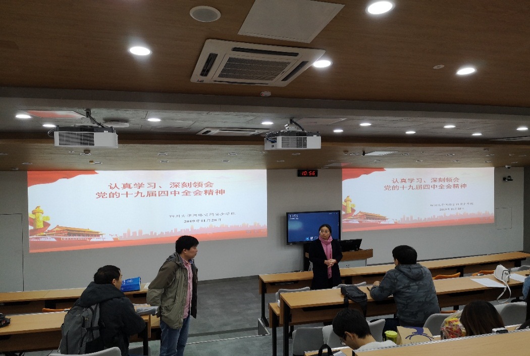 网络空间安全学院直属党支部高度重视党的十九届四中全会精神的学习宣传和贯彻落实工作。11月29日9点,党支部组织全院学生党员在望江校区基础教学楼C101,召开十九届四中全会精神专题学习会暨“不忘初心、牢记使命”主题教育学习会。会议由党支部副书记兼学生科辅导员黎红友老师主持。