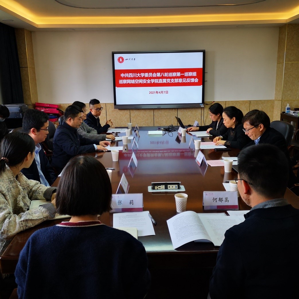 4月7日,学校党委第八轮巡察第一巡察组巡察网络空间安全学院直属党支部意见反馈会在网络空间安全学院东三教503会议室举行。第一巡察组组长韩芳、副组长钱祉祺向网络空间安全学院党政主要负责人反馈巡察情况后,韩芳代表巡察组进行了班子反馈。学校巡察工作领导小组成员、校党政办党委办公室主任李中锋参加会议并提出巡察整改工作要求。学院直属党支部书记秦燕作表态发言,学院常务副院长陈兴蜀主持会议。