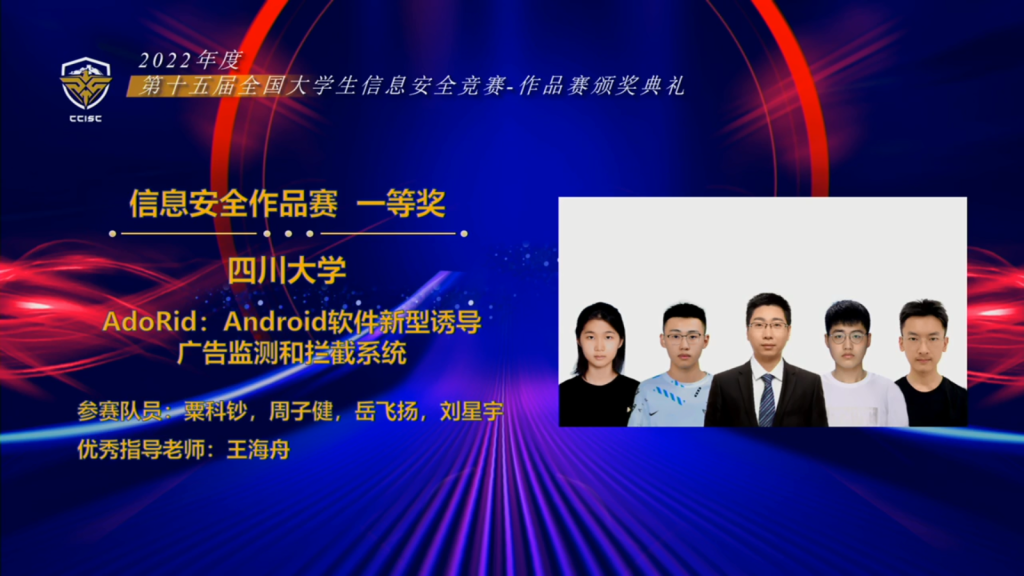 8月22日,第十五届全国大学生信息安全竞赛(作品赛)获奖名单正式揭晓。我院本科生在本次竞赛中再创佳绩,斩获全国最具创业价值奖2项(全国共10项,该奖项获奖队伍数在所有参赛高校中并列第一)、全国一等奖2项、全国二等奖5项、全国三等奖1项。王海舟、黄诚两位老师荣获优秀指导教师奖。尤其值得一提的是获得最具创业价值奖的项目“AdoRid:Android软件新型诱导广告监测和拦截系统”是由2020级(大二)网安少年生为主完成的项目。
