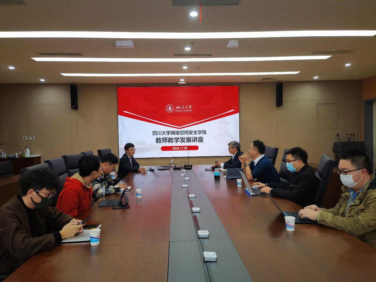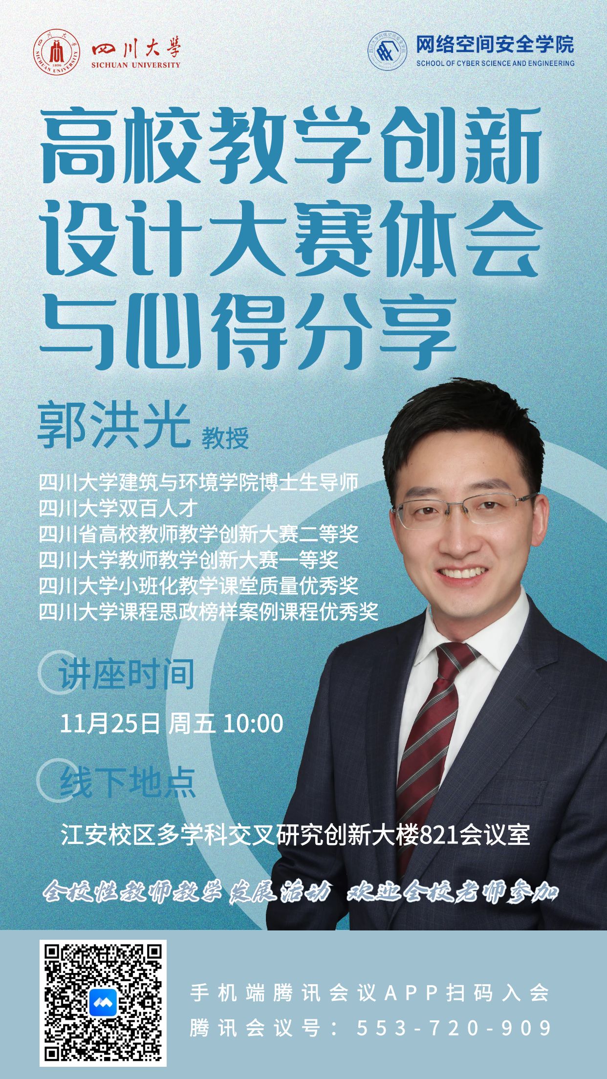 11月25日,我院在江安校区多学科交叉研究创新大楼821会议室成功开展网络空间安全学院教师教学发展活动——预热第六届教师教学创新大赛,学院邀请到了建筑与环境学院郭洪光教授作为主讲嘉宾,以“高校教师教学创新大赛体会与心得分享”为主题,带领老师们深入了解教师教学创新大赛的备赛要求和参赛经验。活动由学院副院长杨频主持,学院的30多位老师在线上线下同时参加了此次活动。
