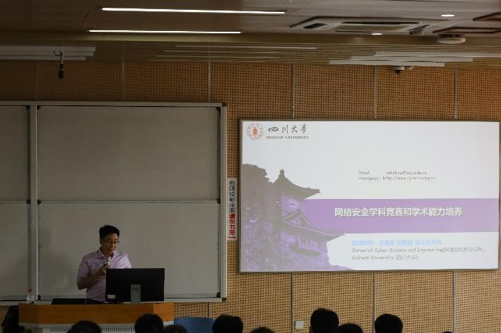 学院优秀教师代表王海舟副教授分享了关于网络空间安全学科竞赛和学术能力培养的宝贵经验,为新生们指明了科研竞赛的方向。