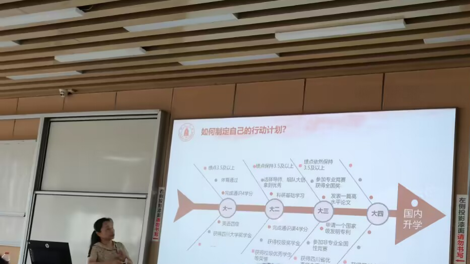 陈兴蜀教授以新时代川大人的事迹为例,鼓励大家树立远大理想,增强自我了解,明确发展目标。她提出,同学们要以自己的兴趣、性格、价值观和职业能力四个维度,激发构建适合自我的前进目标和生涯发展动力。
