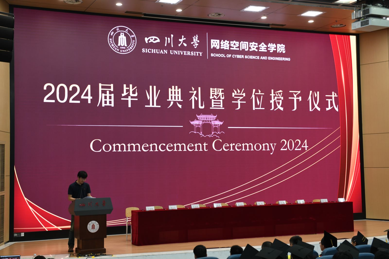 2024年6月20日下午,四川大学网络空间安全学院2024届学生毕业典礼暨学位授予仪式于江安校区水上报告厅隆重举行。学院党总支书记秦燕、院长陈兴蜀、副院长杨频以及多位教师代表出席活动。