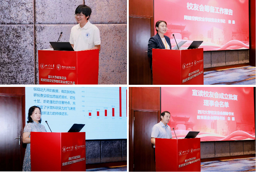 网络空间安全学院党总支副书记、副院长张意主持大会。学院党总支书记秦燕作校友会筹备工作报告,院长陈兴蜀汇报学院建设与发展情况。四川大学对外联络办公室副主任、校友总会副秘书长白鹏宣读《关于同意成立四川大学校友总会网络空间安全学院校友会的批复》及《四川大学校友总会网络空间安全学院校友会第一届理事会成员名单》。