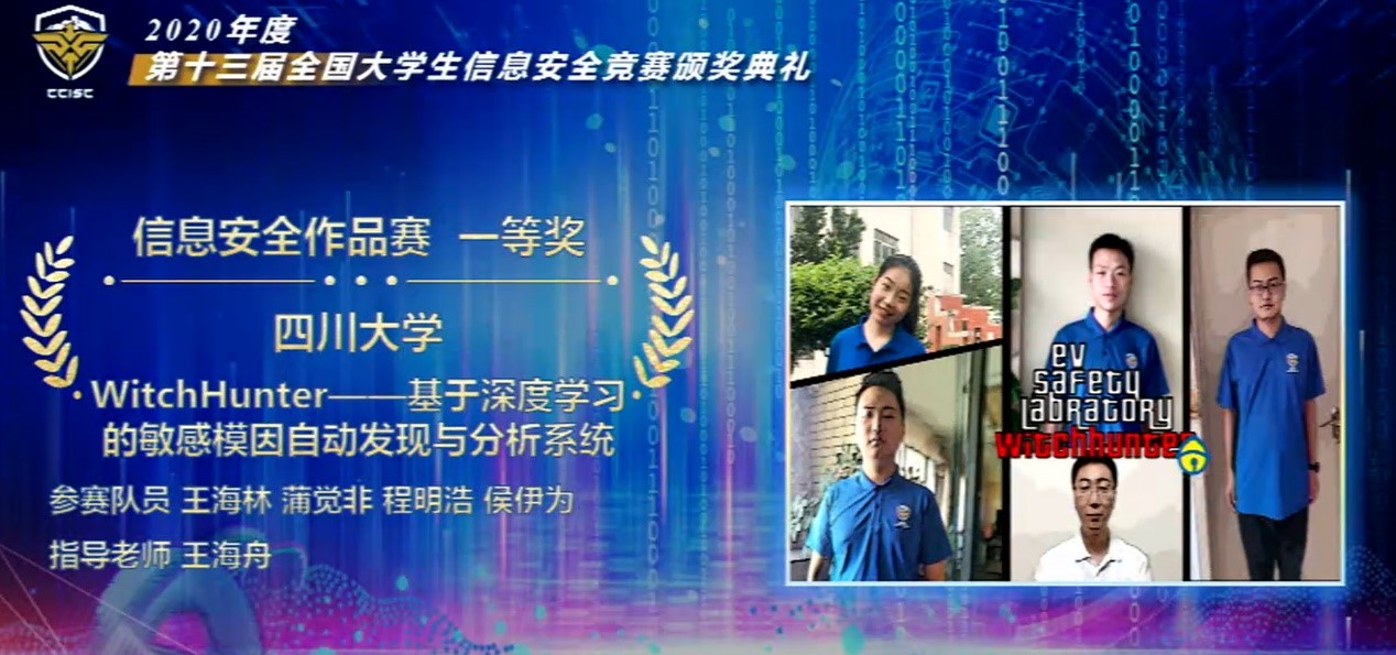 8月19日,第十三届全国大学生信息安全竞赛(作品赛)获奖名单正式揭晓。我院学子在本次竞赛中再创佳绩,斩获全国一等奖2项、二等奖3项、三等奖1项。其中一等奖项目“WitchHunter-基于深度学习的敏感模因自动发现与分析系统”还获得了本次大赛特别设立的“最具创新创业价值奖”。四川大学荣获优秀组织奖(共八所高校,位列第一),王海舟、黄诚两位老师荣获优秀指导教师奖。