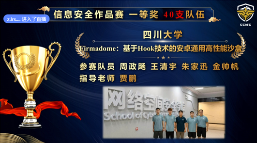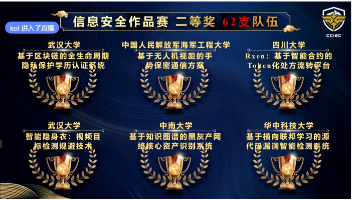 全国大学生信息安全竞赛由教育部高等学校网络空间安全专业教学指导委员会主办,是我国网络空间安全学科领域的奥林匹克竞赛。据悉,全国大学生信息安全竞赛已正式入选全国普通高校学科竞赛排行榜,为目前网络空间安全学科领域唯一一个入选排行榜的赛事。本届作品赛由山东大学承办,总决赛采取线上随机分区评审的形式,共有来自全国156所高校的718支团队、2603名大学生参加,最终评选出最具创新创业价值奖2项、一等奖40项、二等奖62项、三等奖81项、优胜奖113项。