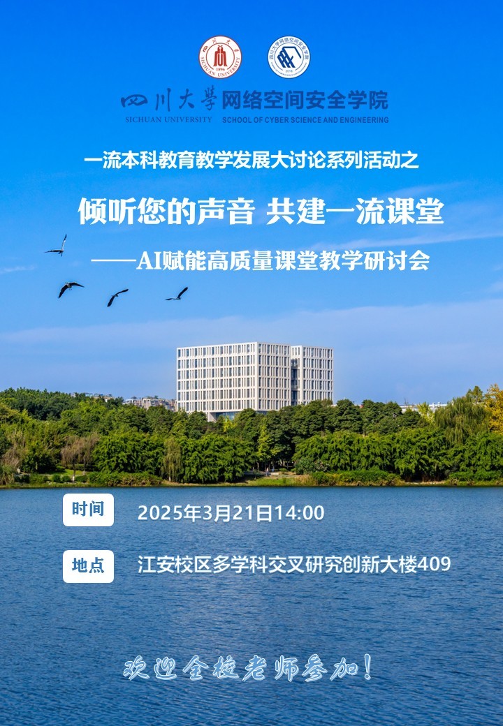 为落实学校“一流本科教育教学发展大讨论”工作,AI如何有效融入课堂、辅助教育教学、培养学生独立思考能力,2025321日下午,网络空间安全学院在江安校区多学科交叉研究创新大楼409举办“倾听您的声音,共建一流课堂——AI赋能高质量课堂教学研讨会”暨2024-2025学年春季学期本科教学反馈会。学院党总支书记秦燕、副院长杨频、院长助理黄诚、本科督导组组长刘嘉勇、本科辅导员、本科教学科老师以及大一、大二、大三各班学生代表参加了本次会议,会议由杨频教授主持。