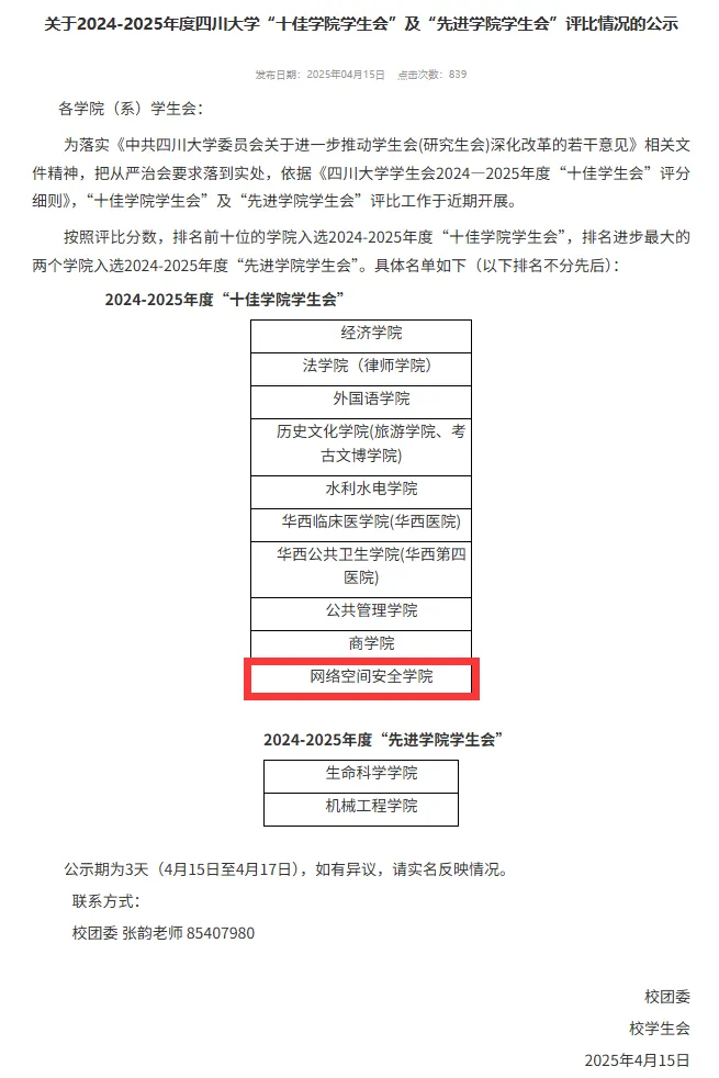 经校团委综合评审与全校公示,网络空间安全学院团委学生会凭借扎实的工作成效与突出的服务贡献,在2024-2025年度四川大学“十佳学院学生会”评选中脱颖而出,首次荣获“十佳学院学生会”荣誉称号。特此向全院师生报喜!