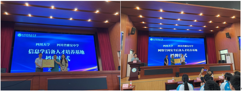 座谈会结束后,双方举行了信息学后备人才和网络空间安全后备人才培养基地的授牌仪式,标志着两校在信息学人才培养方面的合作进入了新的阶段。未来,四川大学将继续与雅安中学携手,共同开展信息学课程建设、师资培训、学术交流等多方面合作,努力为国家培养更多优秀的信息学人才。
