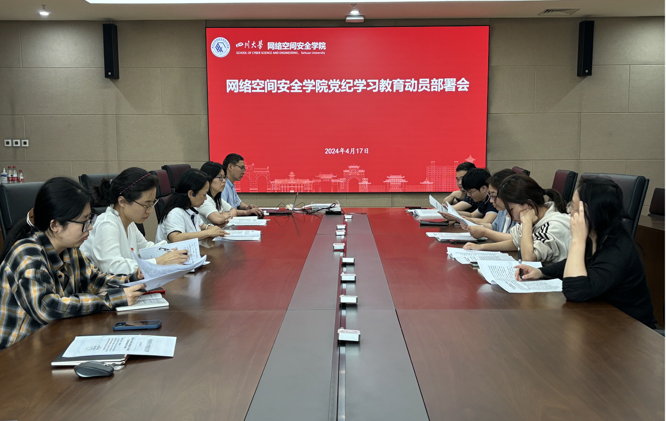 4月17日,网络空间安全学院在学院821会议室召开党纪学习教育动员部署会。学院党总支书记秦燕传达学校党纪学习教育动员部署会议精神,学院全体领导、党总支委员、专职组织员、各党支部书记参加会议。会议由秦燕主持。